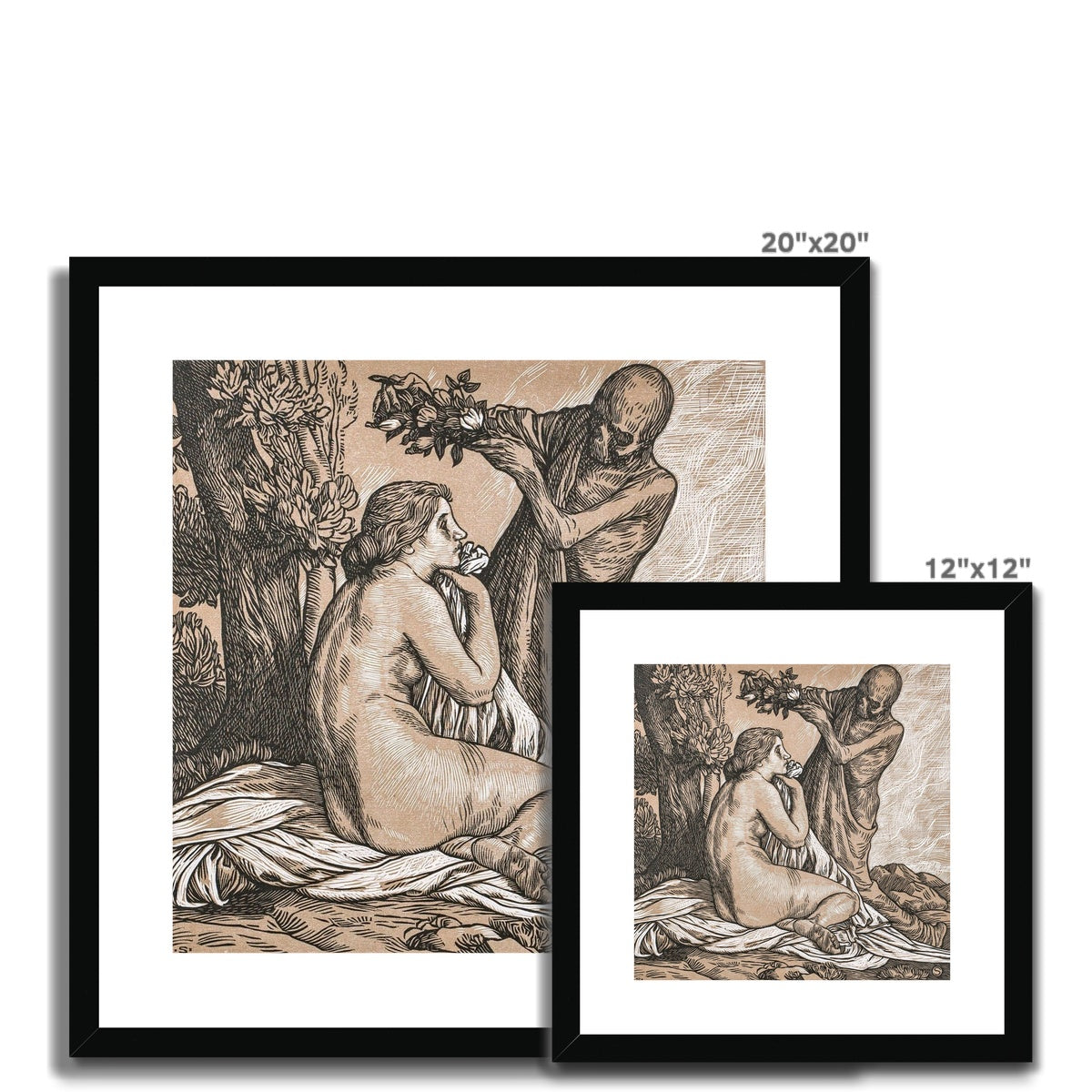 In this haunting allegorical engraving, William Strang portrays Death not as a destroyer but as a seducer. A skeletal figure, cloaked in shadow, crowns a contemplative nude woman with a wreath of flowers—symbols of both beauty and mortality. The intimate yet chilling encounter blurs the line between desire and demise, reflecting Strang’s fascination with the eternal tension between life’s sensual vitality and its inevitable decay. Rendered with meticulous linework and tonal restraint, the scene evokes the macabre lyricism characteristic of the Symbolist movement.
