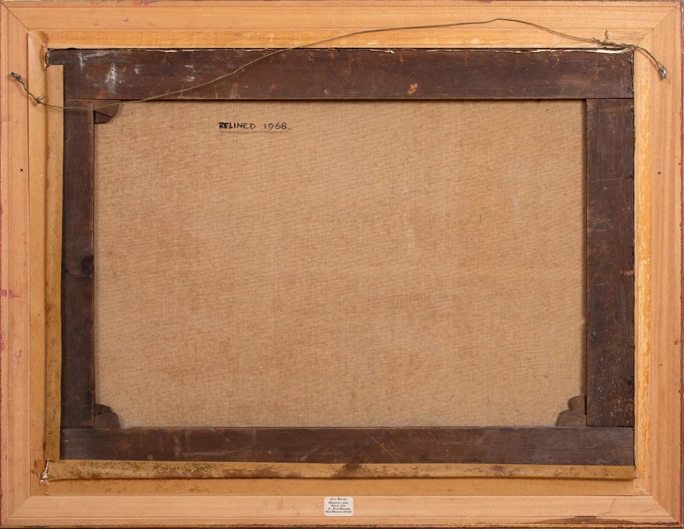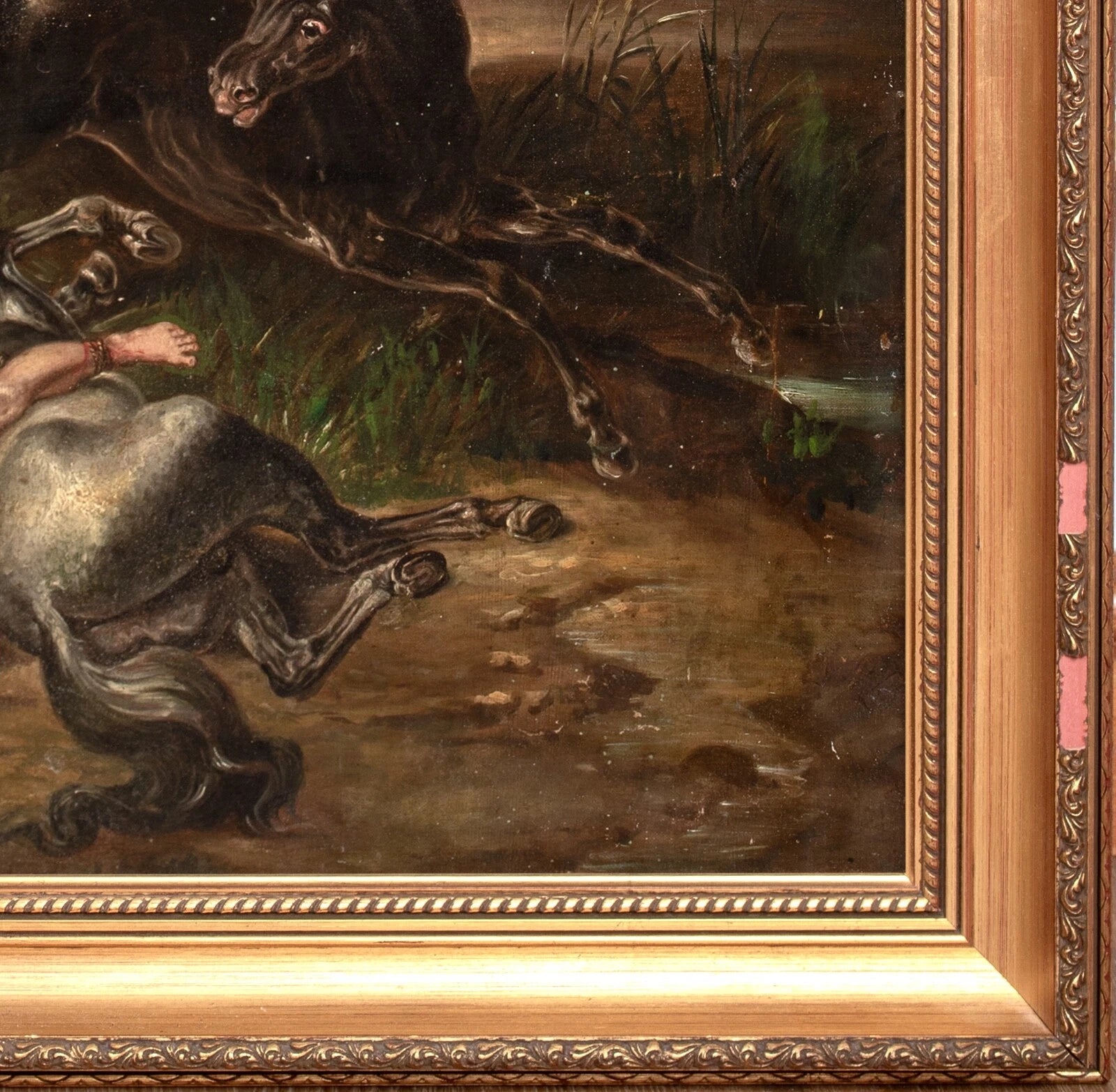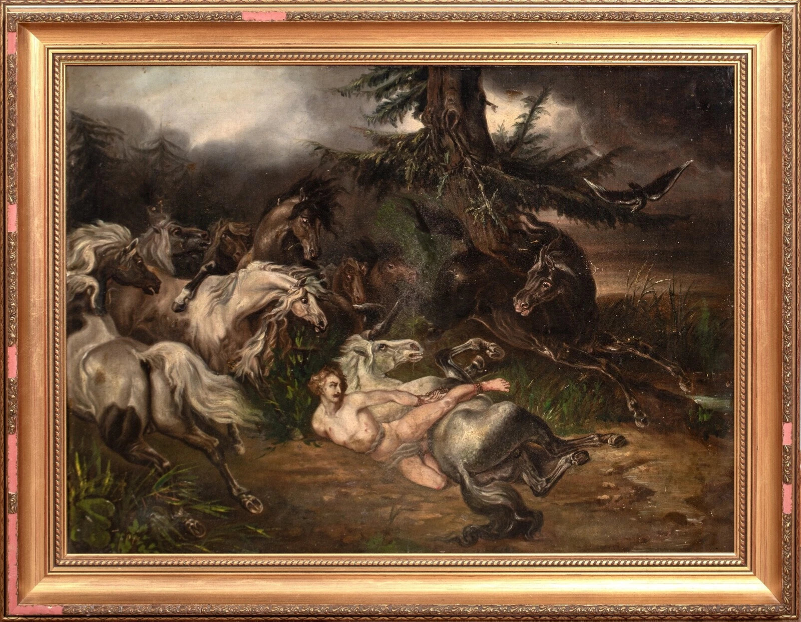 Large 19th century English oil painting depicting a dramatic scene from Lord Byron’s narrative poem "Mazeppa". Executed circa 1880, this finely rendered work illustrates the Romantic legend of the Ukrainian military leader condemned to be bound naked to a wild horse and carried into the wilderness. The subject, celebrated for its themes of endurance and passion, captivated artists of the period—including Herring and Vernet—who produced their own interpretations of Byron’s tale.