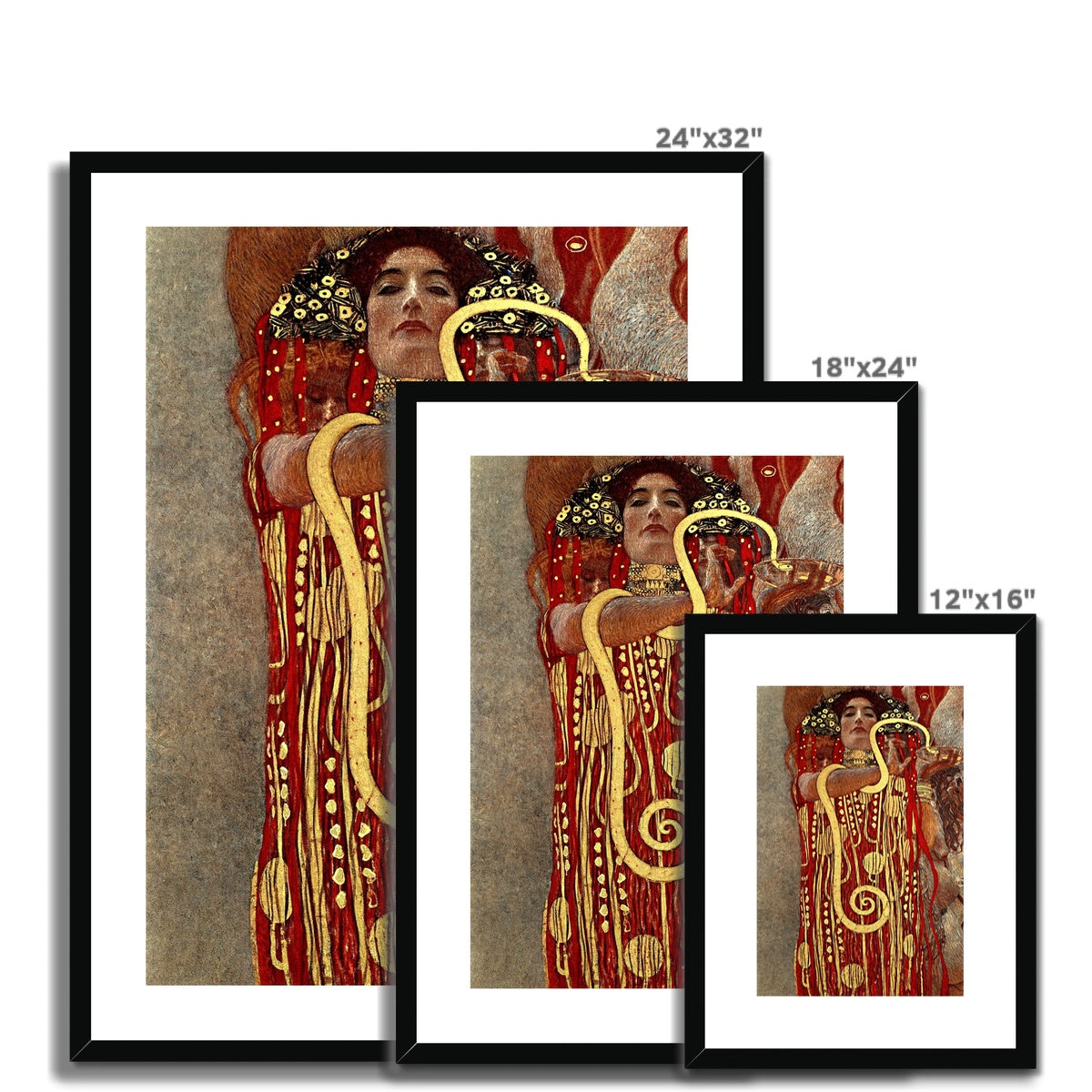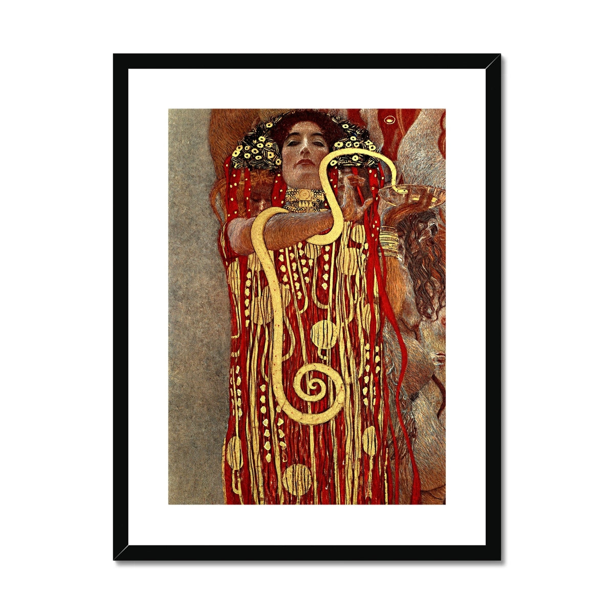 In this richly symbolic work, Gustav Klimt portrays Hygieia, the Greek goddess of health and hygiene, as a commanding and enigmatic figure. Draped in flowing red and gold, she holds the serpent and chalice—ancient emblems of healing and wisdom. Klimt’s opulent use of gilded ornamentation, intricate patterning, and stylized form exemplifies the Vienna Secession’s synthesis of beauty, mysticism, and symbolism. The goddess’s solemn gaze and the serpentine motifs evoke themes of purity, renewal, and the eternal cycle of life and death.