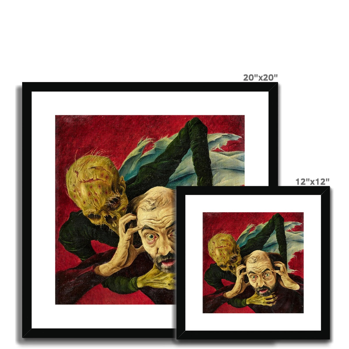 "Irrsinn" (Madness). This haunting Expressionist painting by Albert Birkle portrays a man gripped by psychological torment. A skeletal, monstrous figure looms over him, clawing at his head and shoulders, symbolizing inner demons or madness. With bulging eyes and a distressed expression, the man appears trapped in a state of mental anguish. The stark red background and distorted anatomy heighten the emotional intensity, embodying the raw fear and alienation associated with insanity in post-World War I Germany.