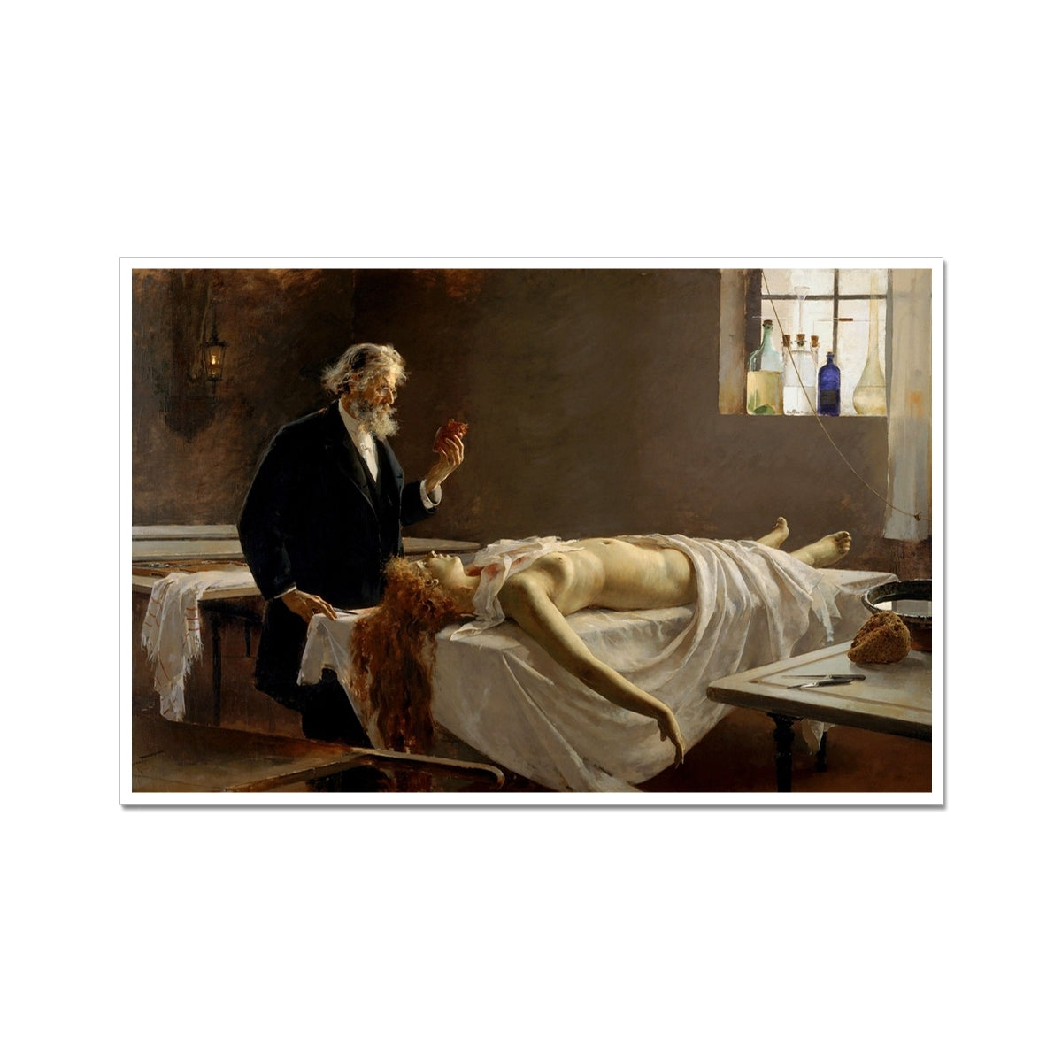 Enrique Simonet’s "An Autopsy" (And She Had a Heart!), painted in 1890, is a striking example of fin-de-siècle realism infused with emotional drama. The composition centers on a solemn physician conducting a post-mortem examination, gazing contemplatively at the heart he holds. Bathed in cool, clinical light, the lifeless figure of a young woman lies draped in white linens, her auburn hair cascading over the table. Simonet’s meticulous detail, subdued palette, and poignant narrative explore the tension between science and sentiment, transforming a medical scene into a meditation on mortality, innocence, and the fragility of human life.