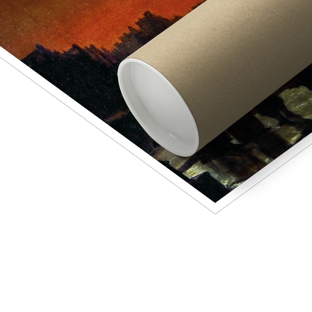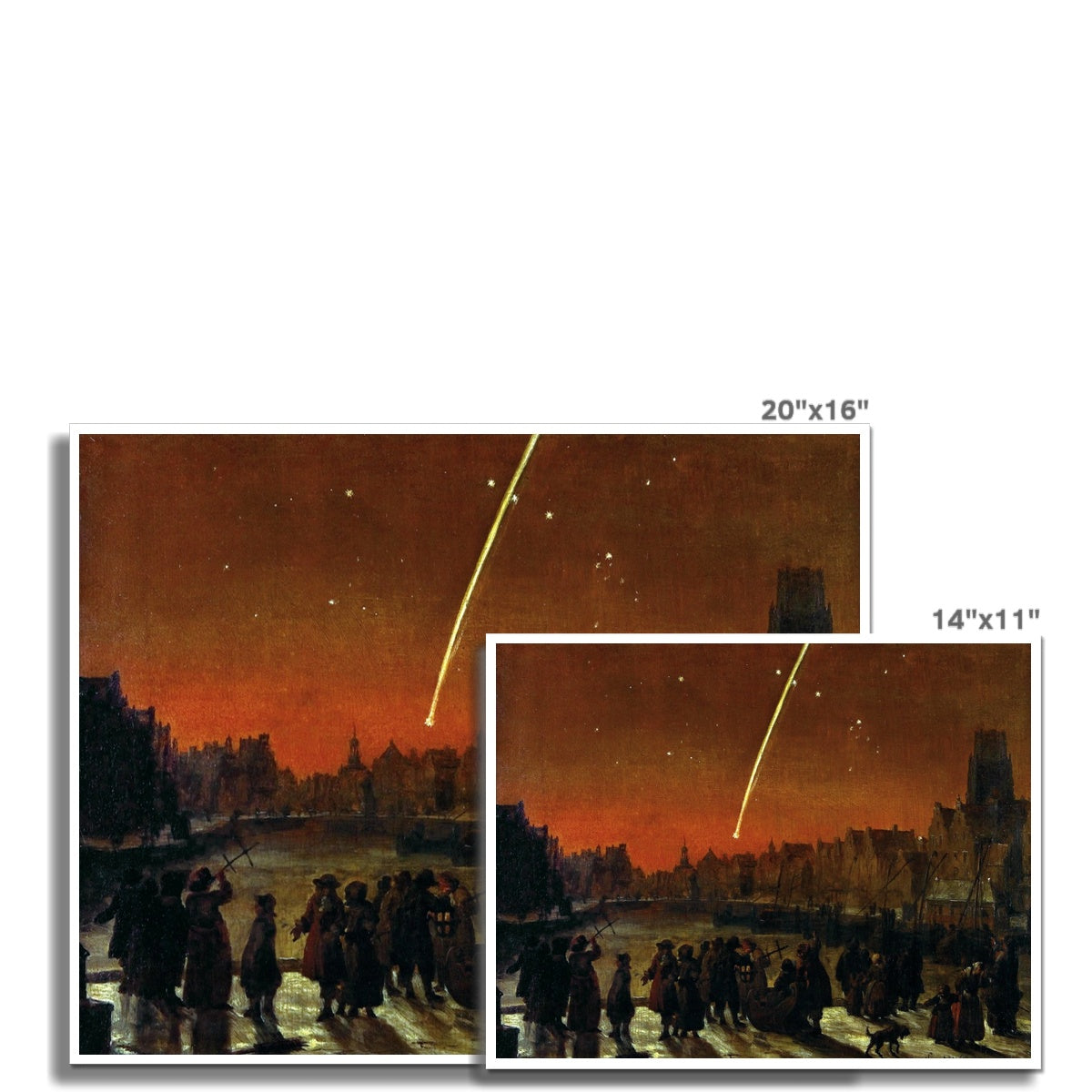 Comet Above Rotterdam (c. 1680) by Lieve Verschuier is a masterful evocation of celestial awe within an urban landscape. Set against the warm glow of a winter twilight, a brilliant comet arcs across the sky above the frozen harbor of Rotterdam, its luminous trail reflected upon the ice. Groups of townspeople pause in reverent fascination, their gestures capturing the blend of wonder and apprehension such phenomena evoked in the seventeenth century. Through his refined treatment of light, atmosphere, and architectural precision, Verschuier transforms a historical astronomical event into a profound meditation on nature’s grandeur and the human impulse to seek meaning in the heavens.