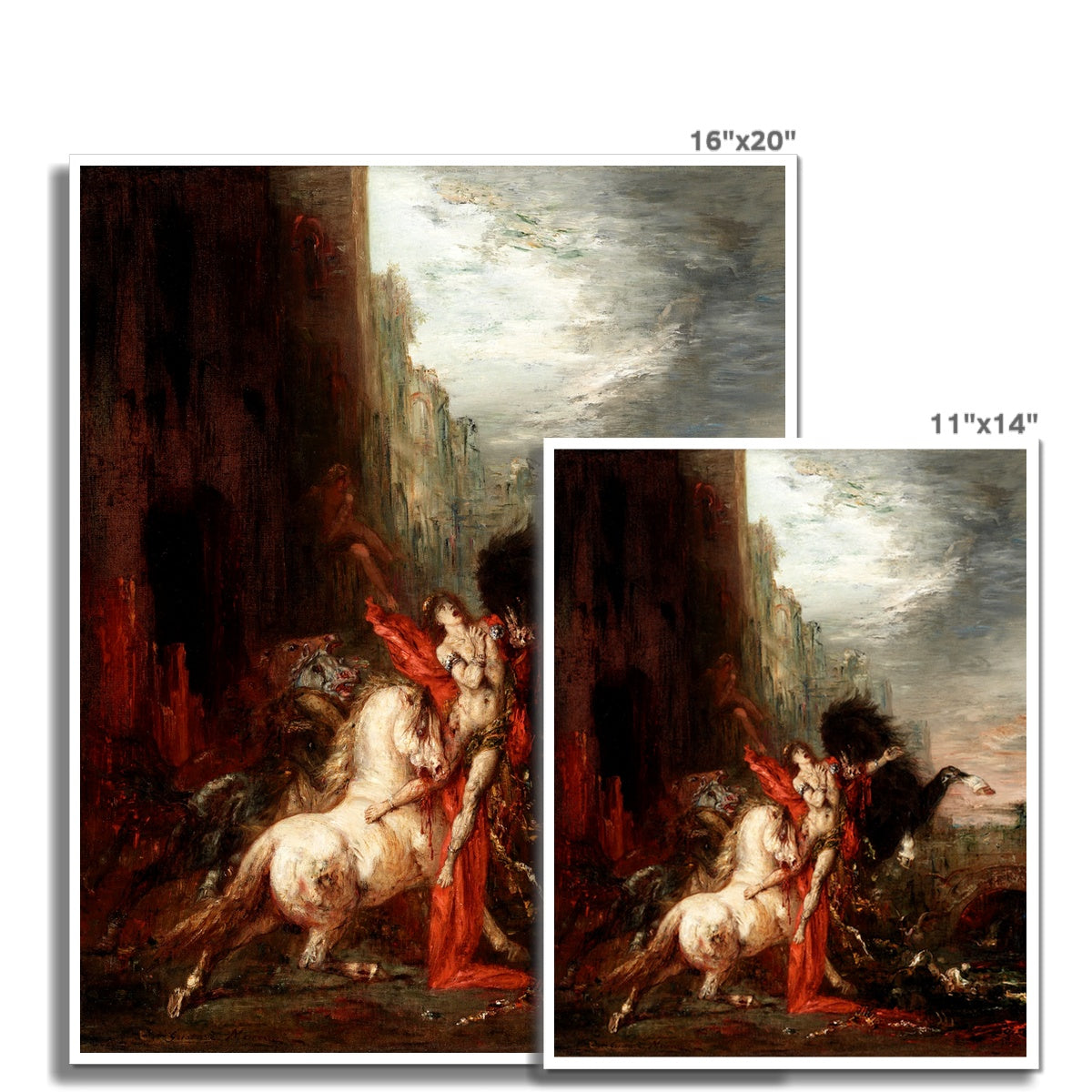 Gustave Moreau’s "Diomedes Devoured by His Horses" (1870) depicts a violent episode from Greek mythology, in which Diomedes, the cruel king of Thrace, is punished for his brutality. According to the myth, Diomedes fed strangers to his savage, man-eating horses until Heracles (Hercules) overthrew him and delivered him to the very beasts he had trained. Moreau presents the moment of retribution in a swirling, dramatic composition, where the frenzied horses and collapsing figure embody both physical terror and moral judgment, transforming the scene into a Symbolist meditation on cruelty, justice, and divine vengeance.