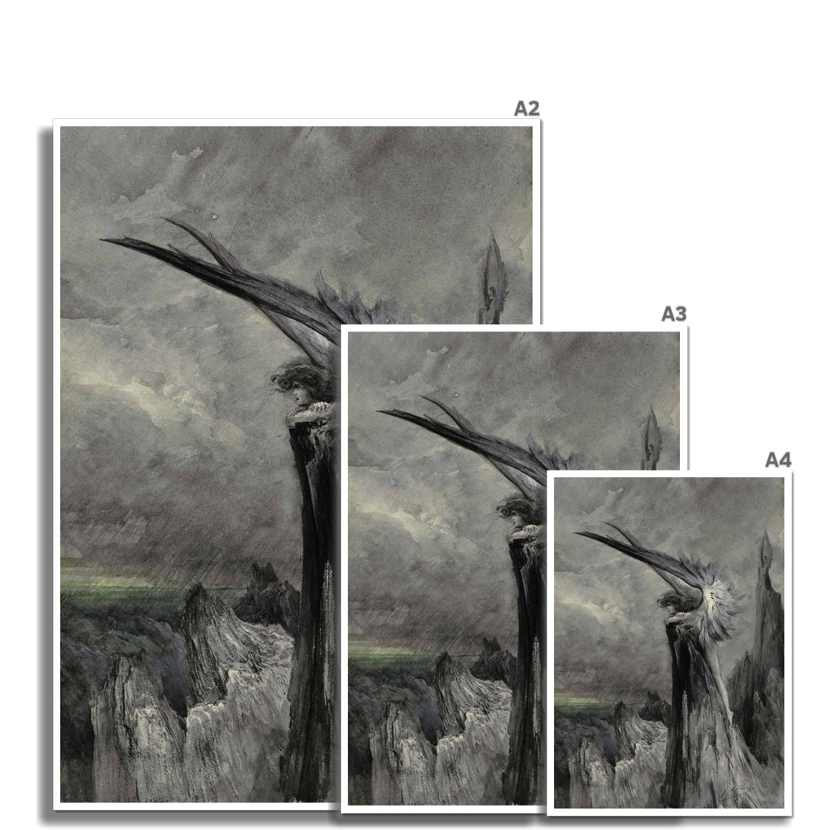 This outstanding work shows a solitary winged chimera poised high above the jagged cliffs of Port Cato on Belle-Île. Her dark, wind swept wings cut through a storm laden sky, while her slightly bowed head, feminine face and flowing form suggest melancholy rather than menace. Rendered in muted greys and blacks, Georges Clairin transforms the coastal landscape into a place of myth and inner turmoil, where the boundary between human emotion and supernatural presence quietly dissolves.