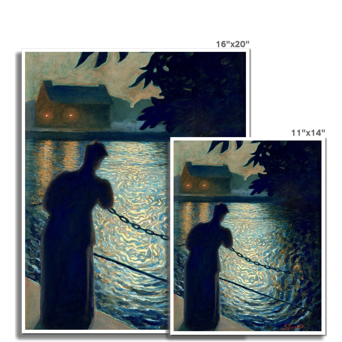 Moonlit Scene, Örebro (1897) by Gustaf Fjaestad presents a contemplative nocturnal vision rendered with striking atmospheric sensitivity. A solitary figure, silhouetted against the luminous surface of the water, gazes across the rippling reflections of moonlight. The interplay of deep shadow and silvery radiance creates a sense of quiet introspection, while the distant house, its windows glowing with a faint red light, enhances the painting’s mood of mystery and solitude.