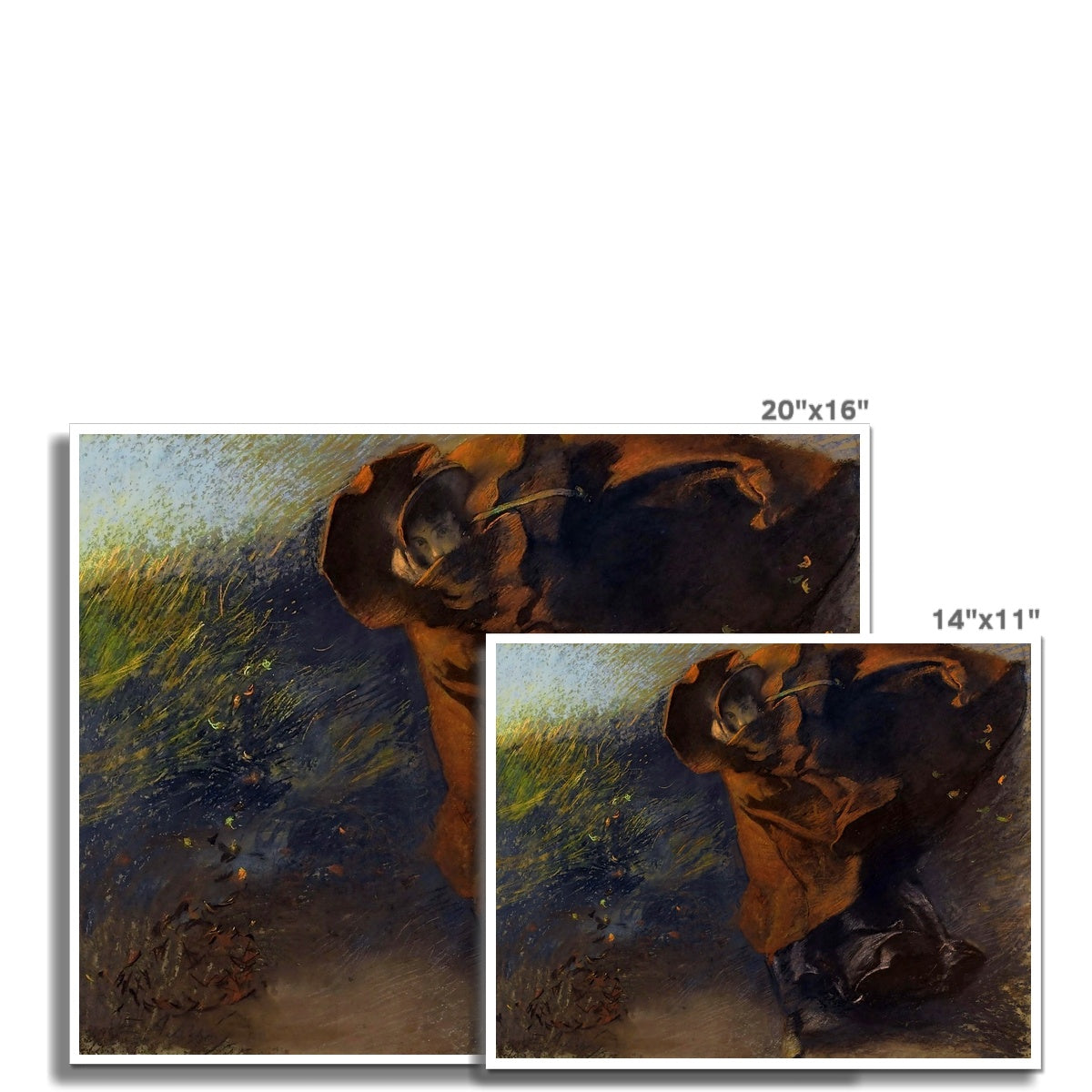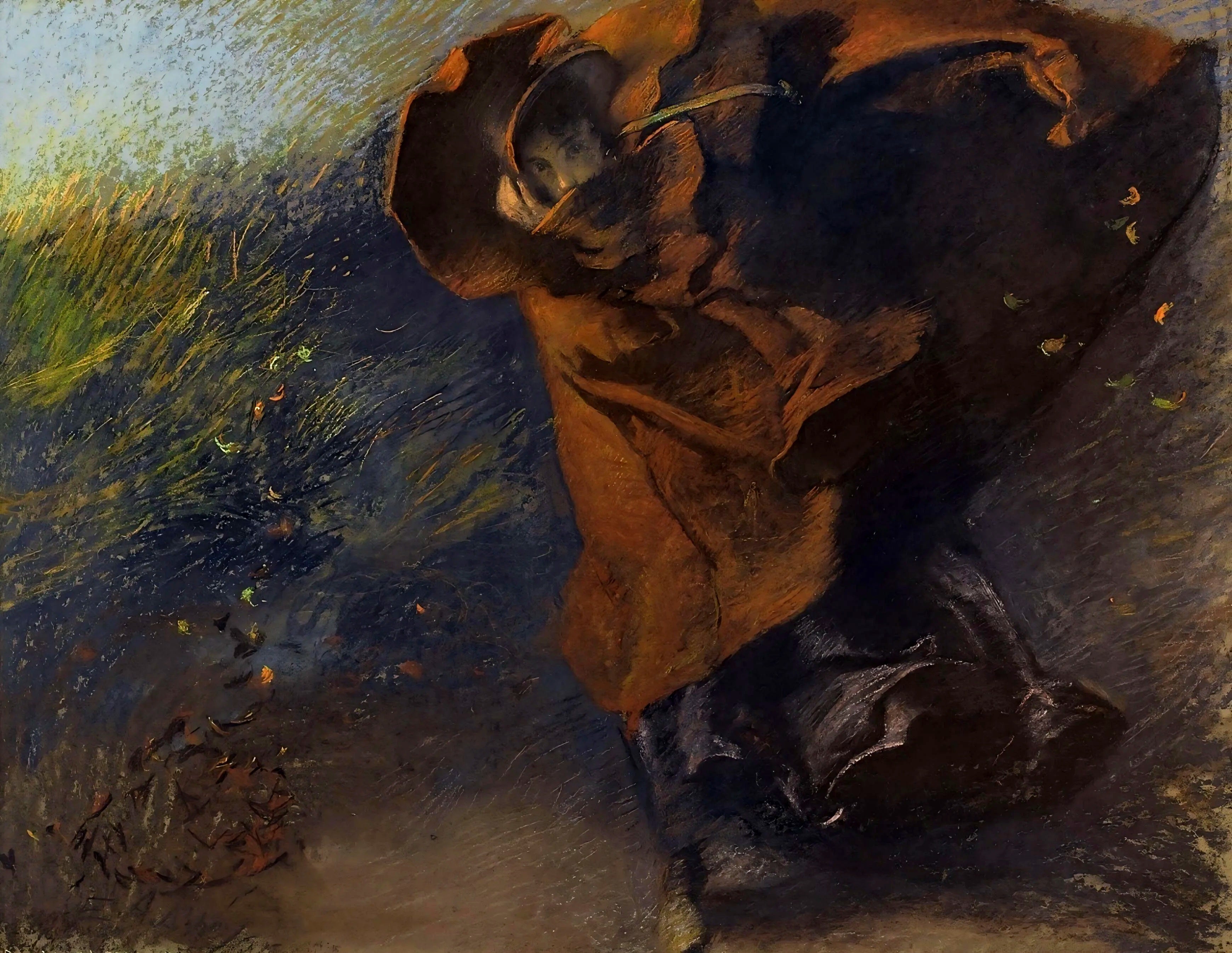 In this dynamic and atmospheric study, Edwin Austin Abbey captures a fleeting moment of struggle against the elements. A solitary figure, cloaked in rich russet tones, braces against a powerful gust that sweeps through the landscape, sending leaves and fabric swirling in motion. Rendered with expressive brushwork and subtle contrasts of light and shadow, The Wind transforms an everyday scene into a poetic meditation on movement, nature, and human resilience.