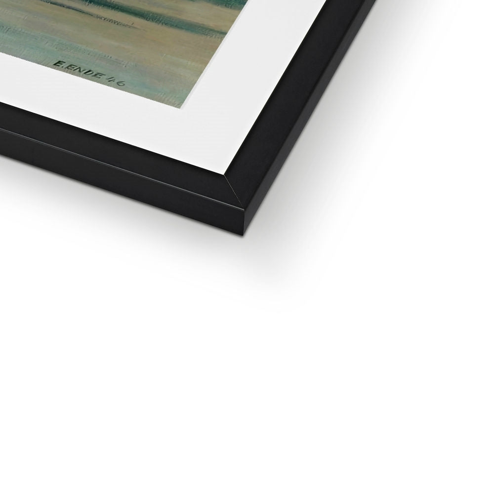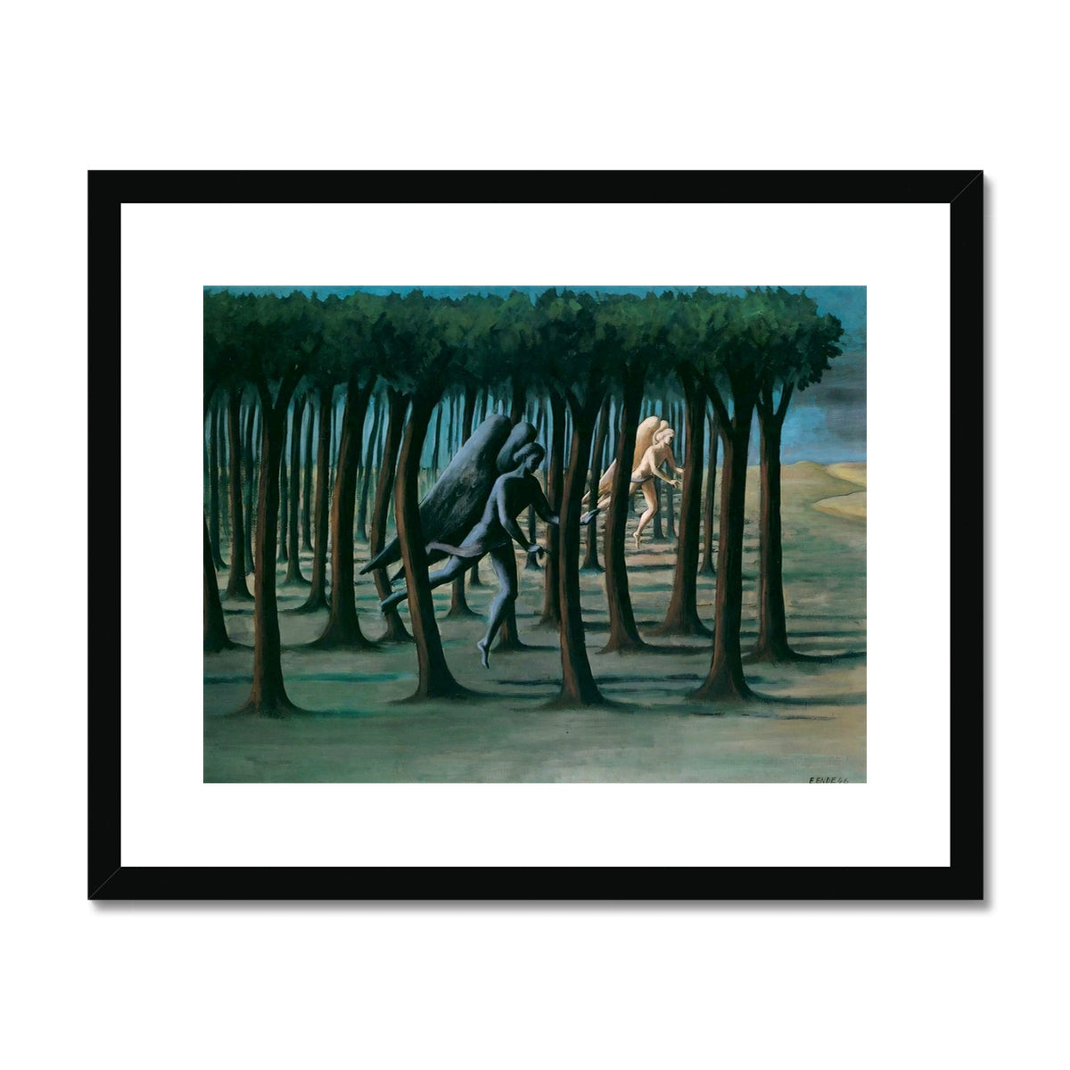 In this enigmatic post-war vision, Edgar Ende stages a surreal procession through a silent forest, where two angelic figures—one pale and luminous, the other shadowed and somber—move in parallel. Their opposing tones evoke a symbolic tension between light and darkness, purity and burden, spiritual ascent and earthly struggle. The rigid verticality of the trees creates a rhythmic, dreamlike labyrinth, heightening the sense of quiet urgency and metaphysical pursuit. Executed in a restrained, muted palette, the work reflects Ende’s introspective and mystical sensibility, exploring inner duality and the fragile balance between hope and despair.