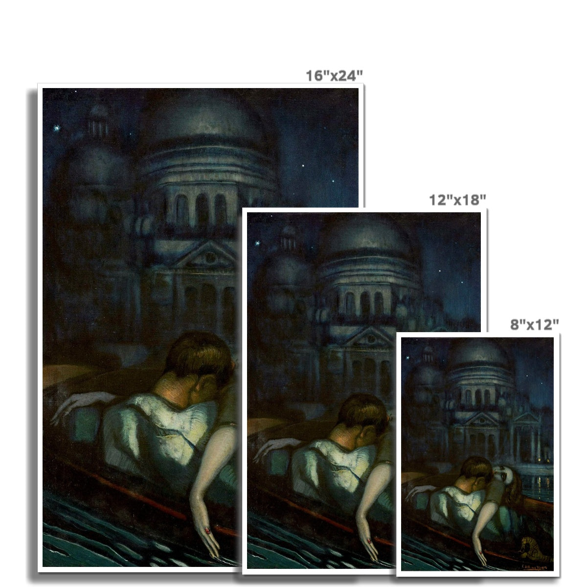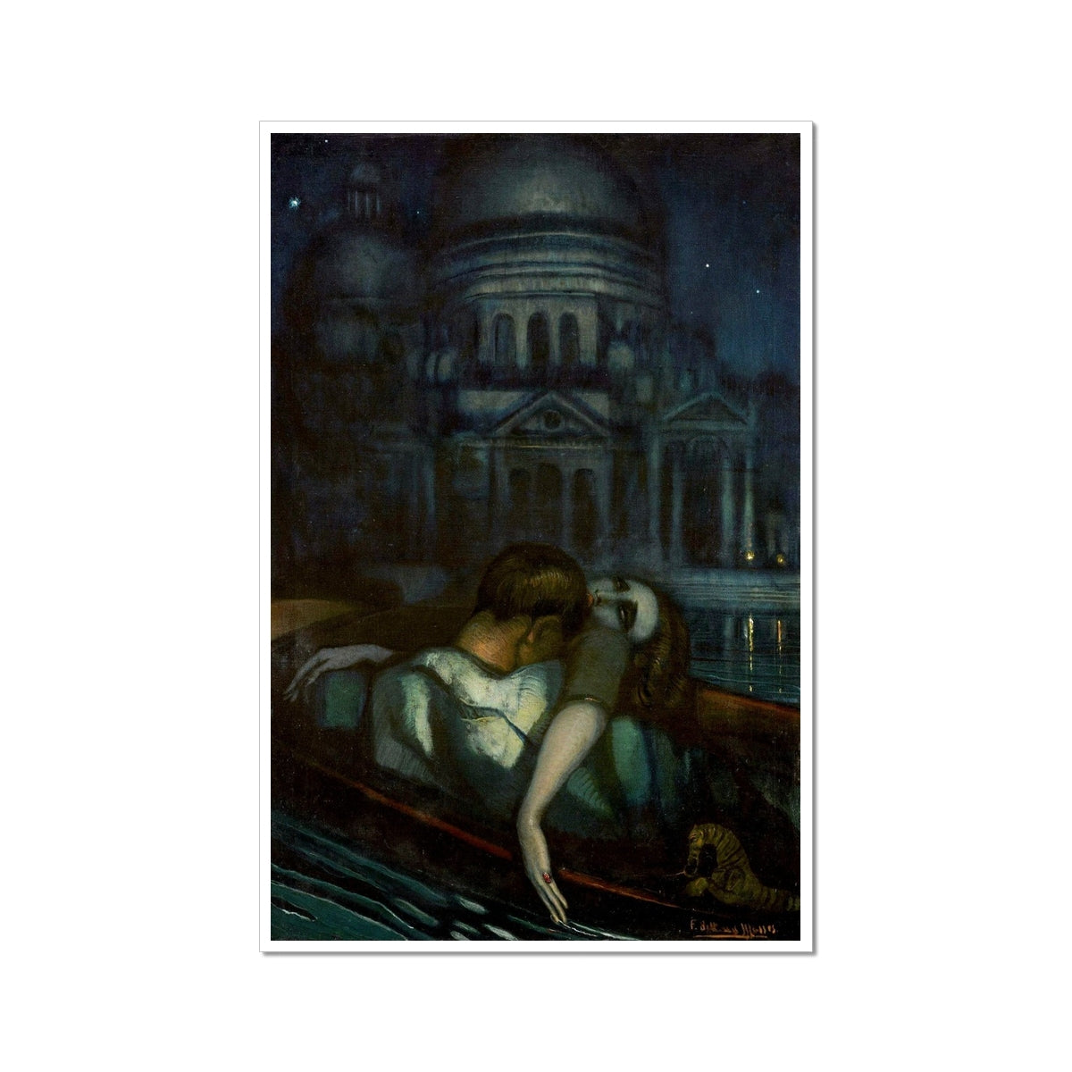 Passion (1932) by Federico Beltrán Masses portrays a mysterious, emotionally charged scene set beneath a dark, dreamlike sky. A couple embraces in a small boat drifting across still water, yet the mood feels far from romantic comfort. The woman’s pale, limp figure creates a haunting atmosphere — she almost appears deceased, her body surrendering to the moment as if caught between passion and oblivion. Behind them, shadowed architecture rises like a ghostly vision, intensifying the sense of unreality. Through deep blues, soft lighting, and theatrical composition, Beltrán Masses blends sensuality with melancholy, transforming intimacy into something eerie and hypnotic.