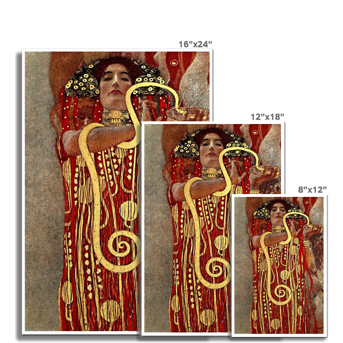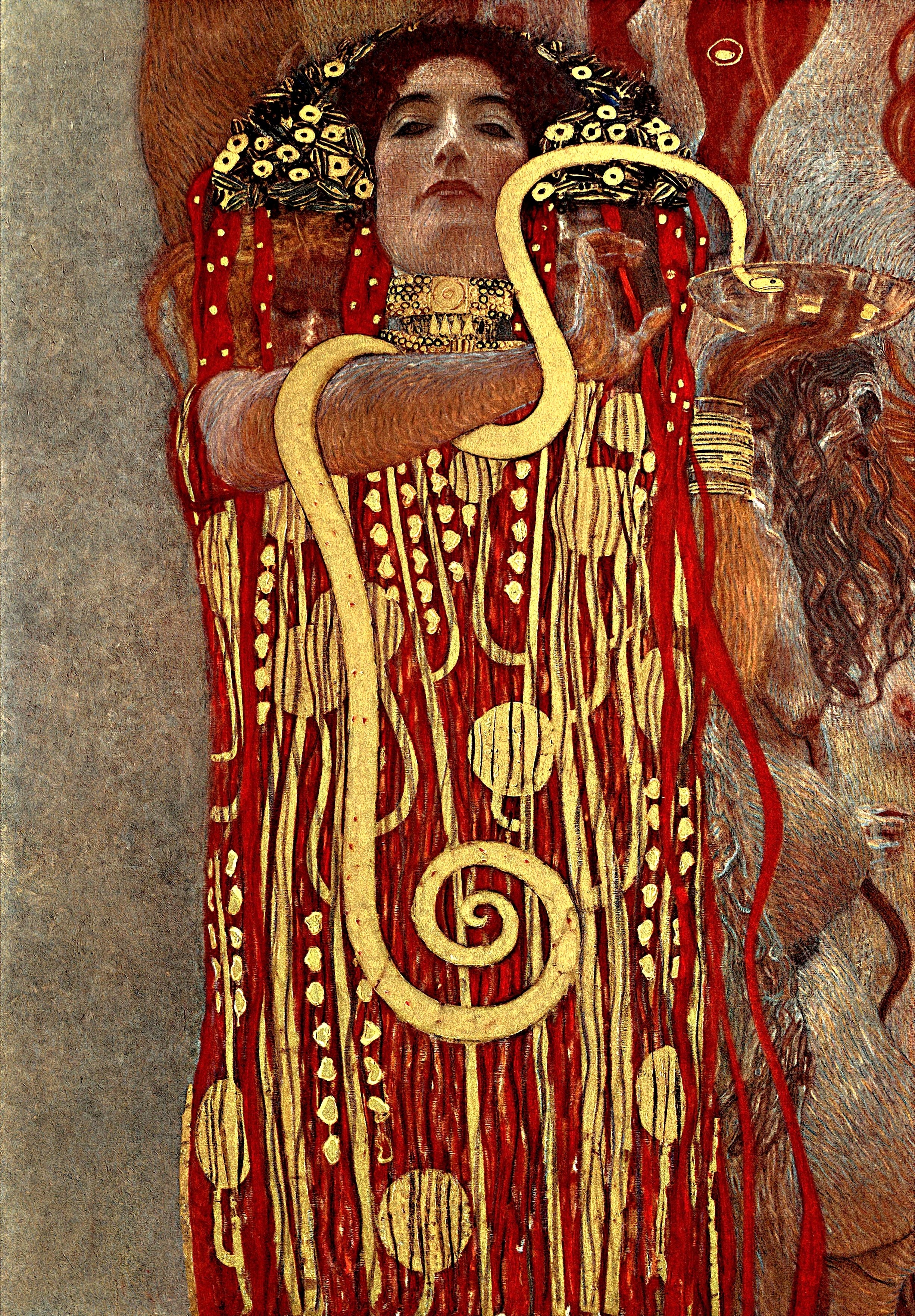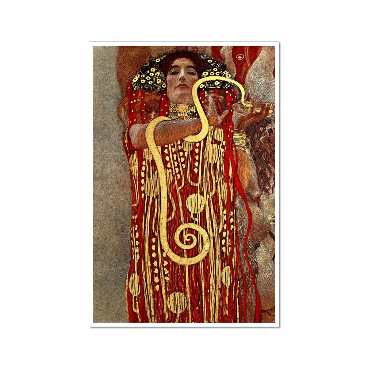 In this richly symbolic work, Gustav Klimt portrays Hygieia, the Greek goddess of health and hygiene, as a commanding and enigmatic figure. Draped in flowing red and gold, she holds the serpent and chalice—ancient emblems of healing and wisdom. Klimt’s opulent use of gilded ornamentation, intricate patterning, and stylized form exemplifies the Vienna Secession’s synthesis of beauty, mysticism, and symbolism. The goddess’s solemn gaze and the serpentine motifs evoke themes of purity, renewal, and the eternal cycle of life and death.