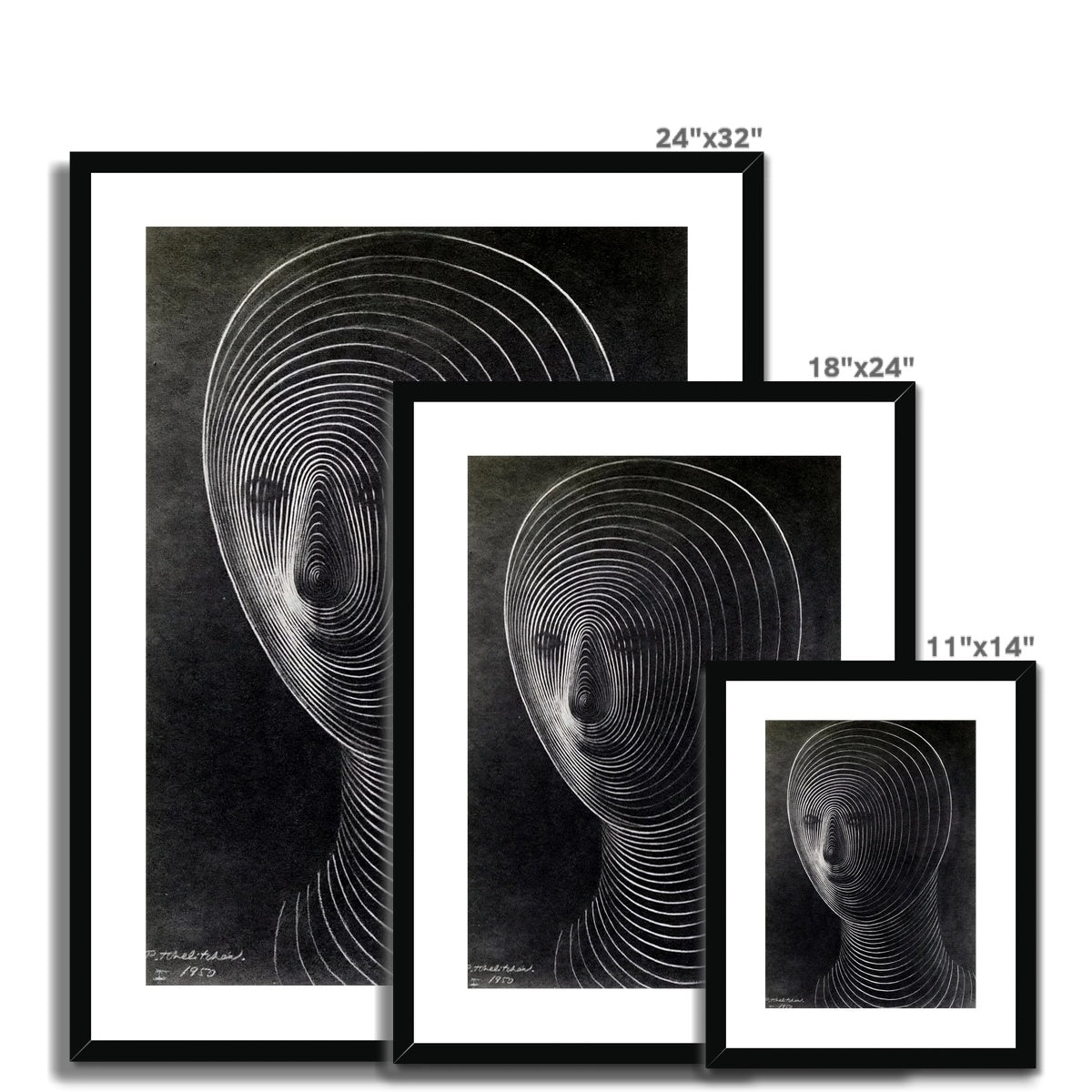This 1950 illustration by Pavel Tchelitchew, Untitled, presents a haunting, abstracted head formed from concentric white lines radiating across a dark background. The spectral contours suggest both a human visage and a geometric construct, merging organic form with optical illusion. Typical of Tchelitchew’s surrealist explorations, the work reflects his fascination with transparency, metamorphosis, and the inner architecture of human identity.