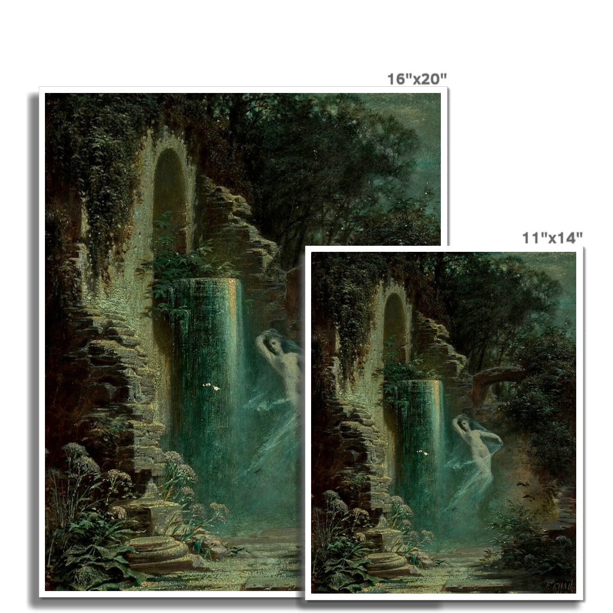 In "Mondnacht" (Moonlit Night) circa 1864, Ferdinand Knab evokes a poetic and dreamlike nocturnal world set within overgrown ruins and softly falling water. A pale, spectral female figure glides through the moonlit air, her form dissolving into mist and light, as if born from the landscape itself. Bathed in cool green and blue tones, the scene blends architecture, nature, and apparition into a single, enchanted vision. The painting captures the Romantic fascination with night, mystery, and the supernatural, transforming the ruin into a stage for quiet, otherworldly reverie.