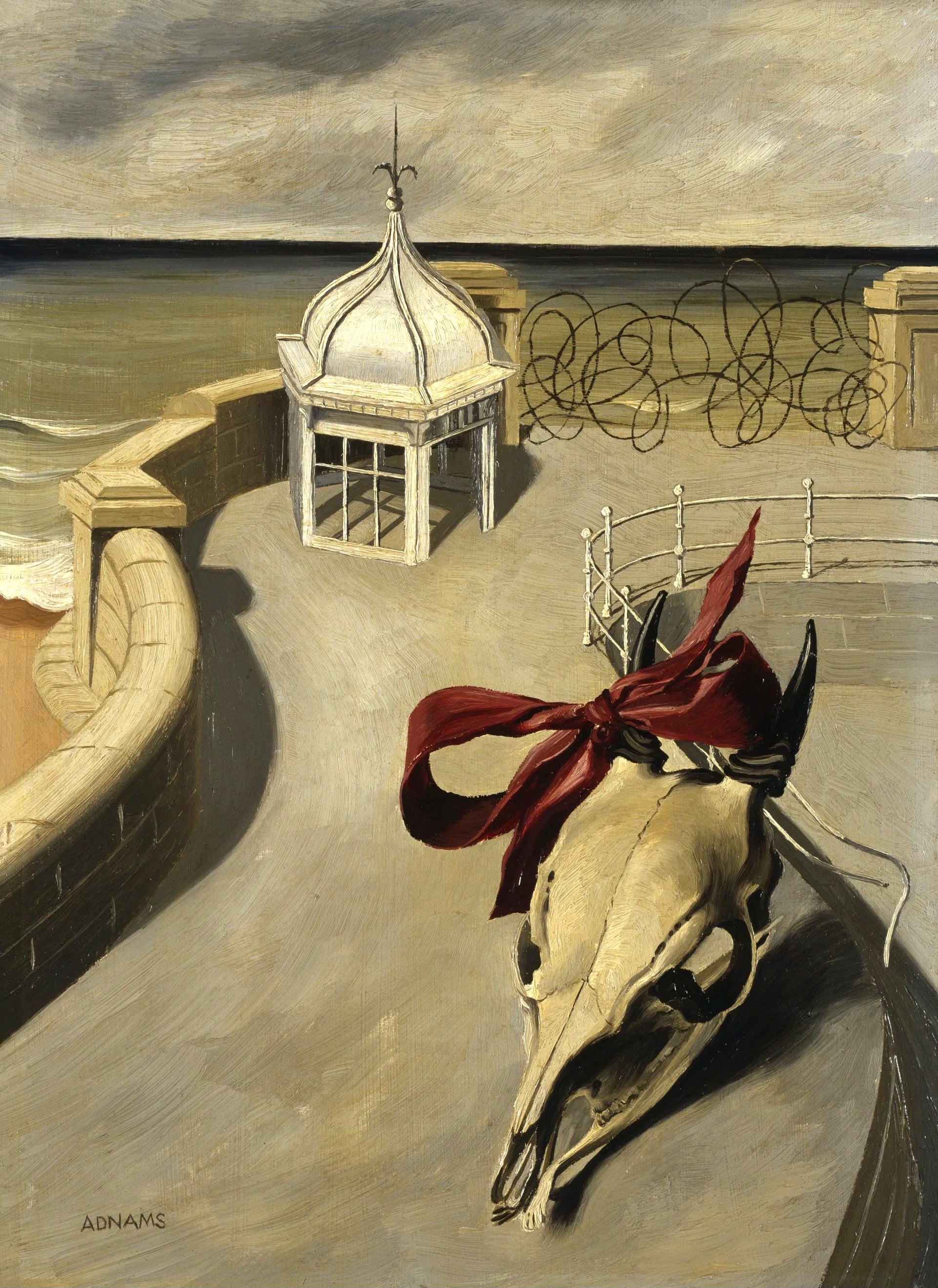 In this haunting surrealist composition, Adnams presents a desolate coastal promenade where a bleached animal skull, adorned with a vivid red ribbon, lies against the cold geometry of stone and sea. The empty pavilion and swirling ironwork suggest an eerie stillness after destruction, blending beauty and decay in equal measure. Painted in the aftermath of World War II, the work reflects both personal and collective desolation—an unsettling meditation on survival, memory, and the fragility of life amidst ruin.