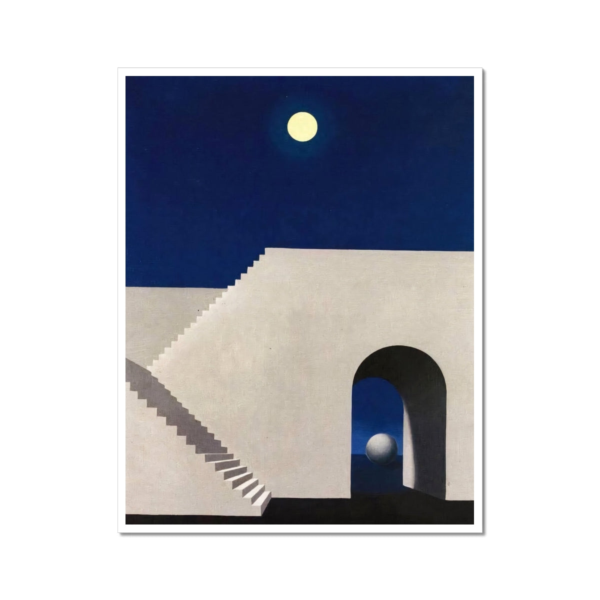 « Architecture au clair de lune » (1956) de René Magritte est un tableau surréaliste et minimaliste qui explore le mystère discret des formes architecturales sous le charme du clair de lune. Dans cette composition onirique, des structures géométriques austères – escaliers, arcades et une sphère solitaire – se dressent figées dans un paysage nocturne silencieux. La pleine lune se détache sur un ciel indigo profond, projetant des ombres douces et étranges qui renforcent le sentiment d'immobilité et d'énigme. Le style précis, presque illusionniste, de Magritte contraste avec l'ambiguïté de la scène, évoquant une contemplation métaphysique et la beauté surréaliste de l'ordinaire rendu étrange.
