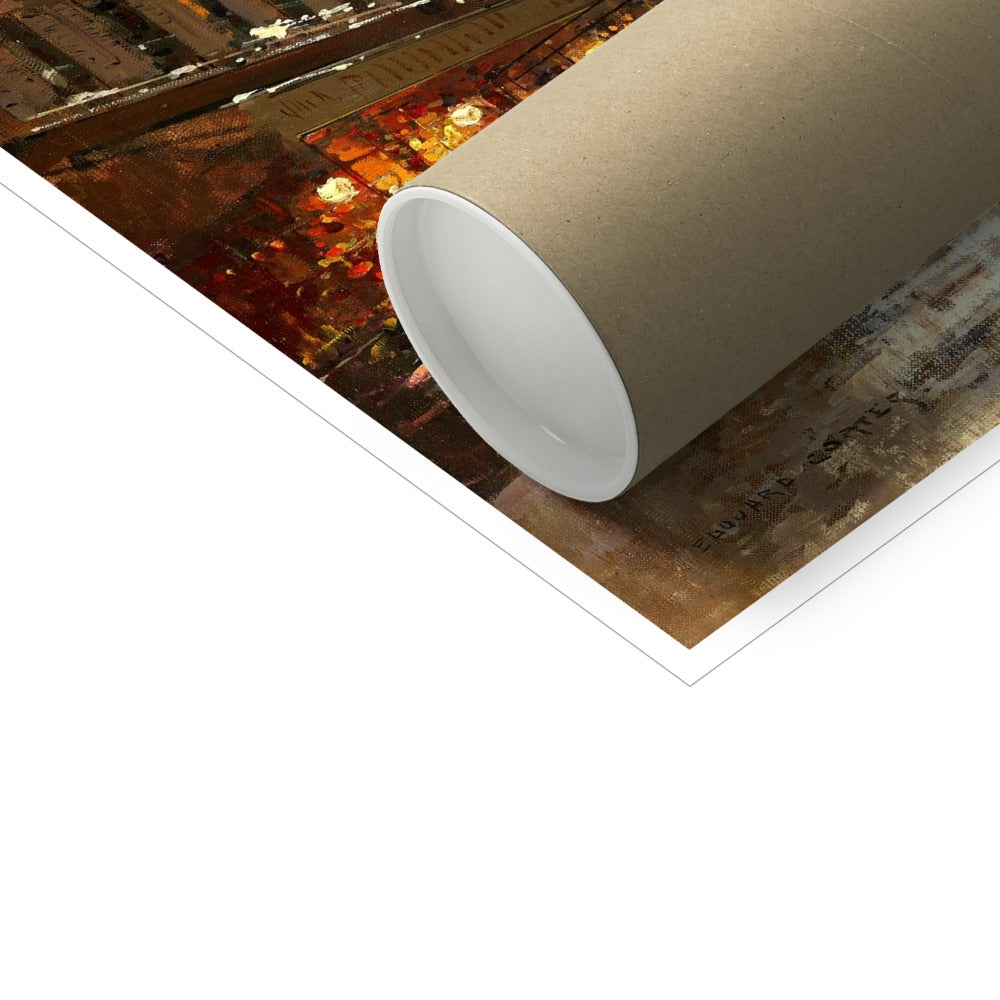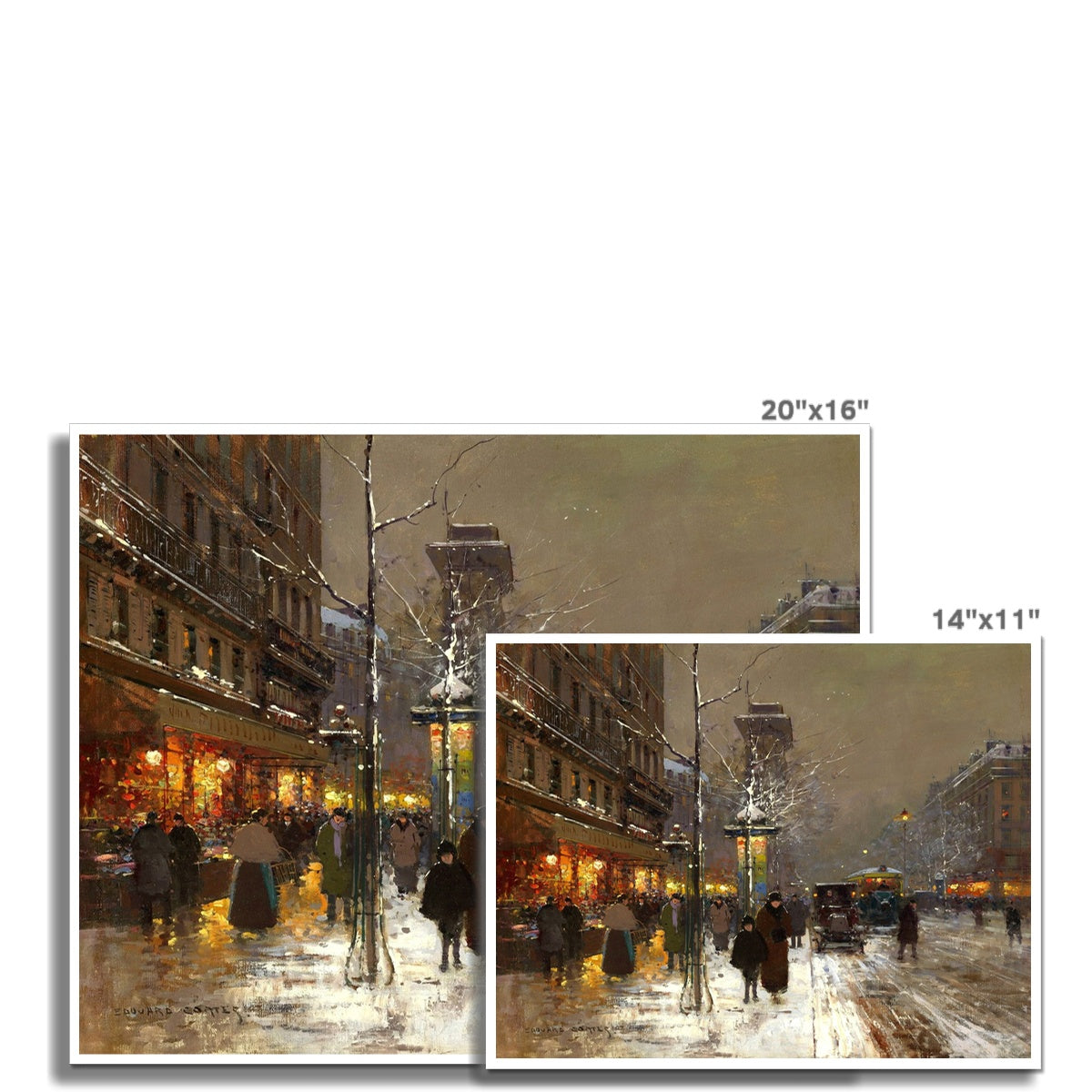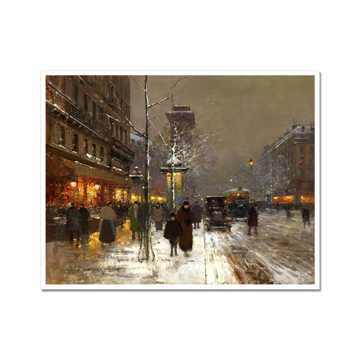 This atmospheric Parisian street scene depicts the Porte Saint-Martin enlivened by falling snow and the warm glow of evening lights. Cortès employs expressive yet controlled brushwork to suggest the movement of pedestrians, carriages, and omnibuses, while reflections shimmer across the snow-dampened street. Balancing urban activity with lyrical mood, the work exemplifies Cortès’s celebrated vision of modern Paris, where everyday city life is transformed into a richly poetic winter tableau.