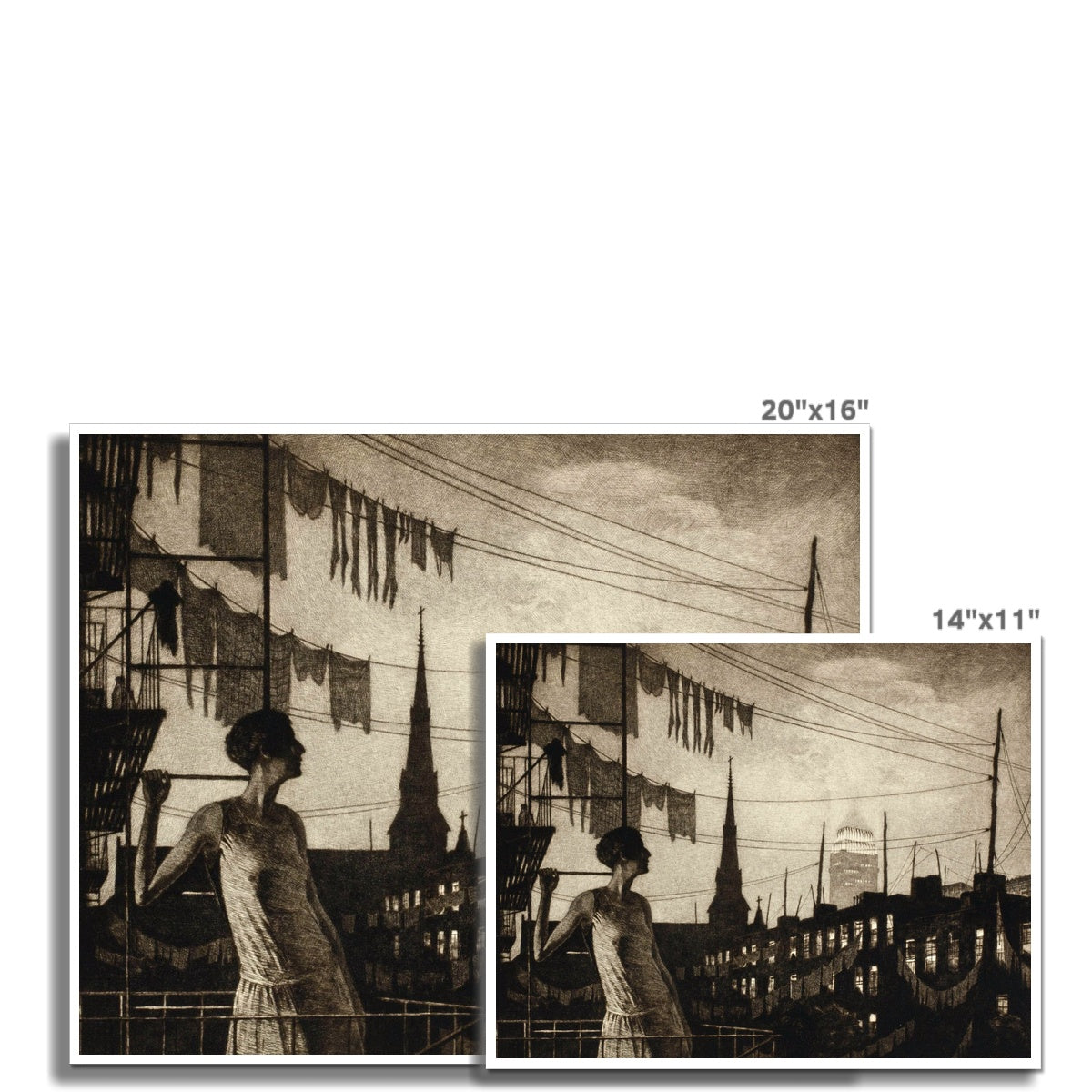 Glow of the City (1929) by Martin Lewis is a masterful drypoint etching capturing the quiet poetry of urban life in 1920s New York. A solitary woman stands on a fire escape, her figure silhouetted against the softly illuminated skyline, where the Chanin Building glows in the evening haze. Lewis contrasts the intimacy of the tenement world—marked by hanging laundry and telephone wires—with the distant glamour of the modern city, evoking themes of isolation, aspiration, and the subtle interplay between light and shadow in the urban night.