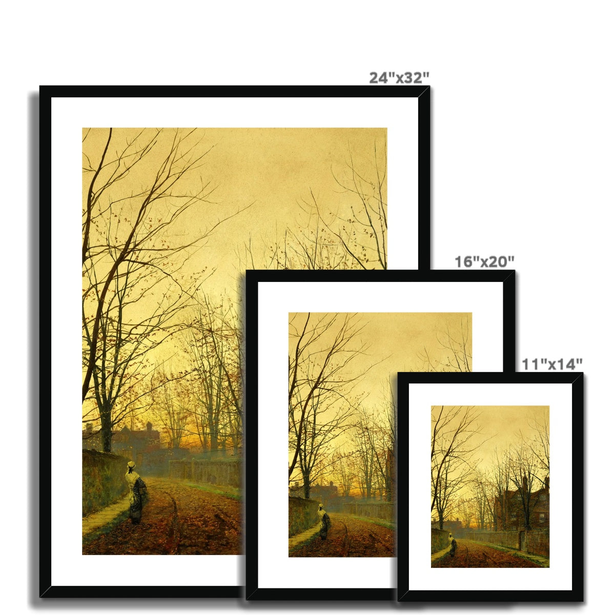 A masterful evocation of autumnal twilight, Late October captures Grimshaw’s signature blend of atmosphere and precision. The scene depicts a solitary figure walking along a leaf-strewn lane bordered by tall, bare trees and the walls of a grand Victorian house. Bathed in a golden, fading light, the composition conveys both serenity and melancholy—an elegy to the passing season. Grimshaw’s meticulous rendering of texture and his luminous treatment of dusk exemplify his poetic vision of Victorian urban and suburban life.