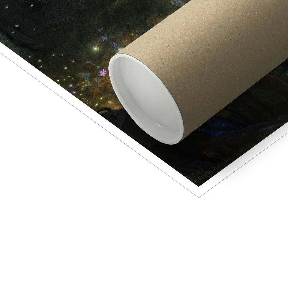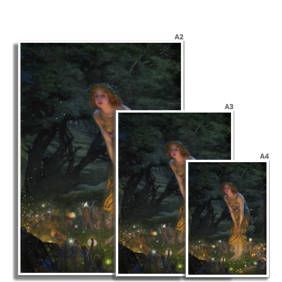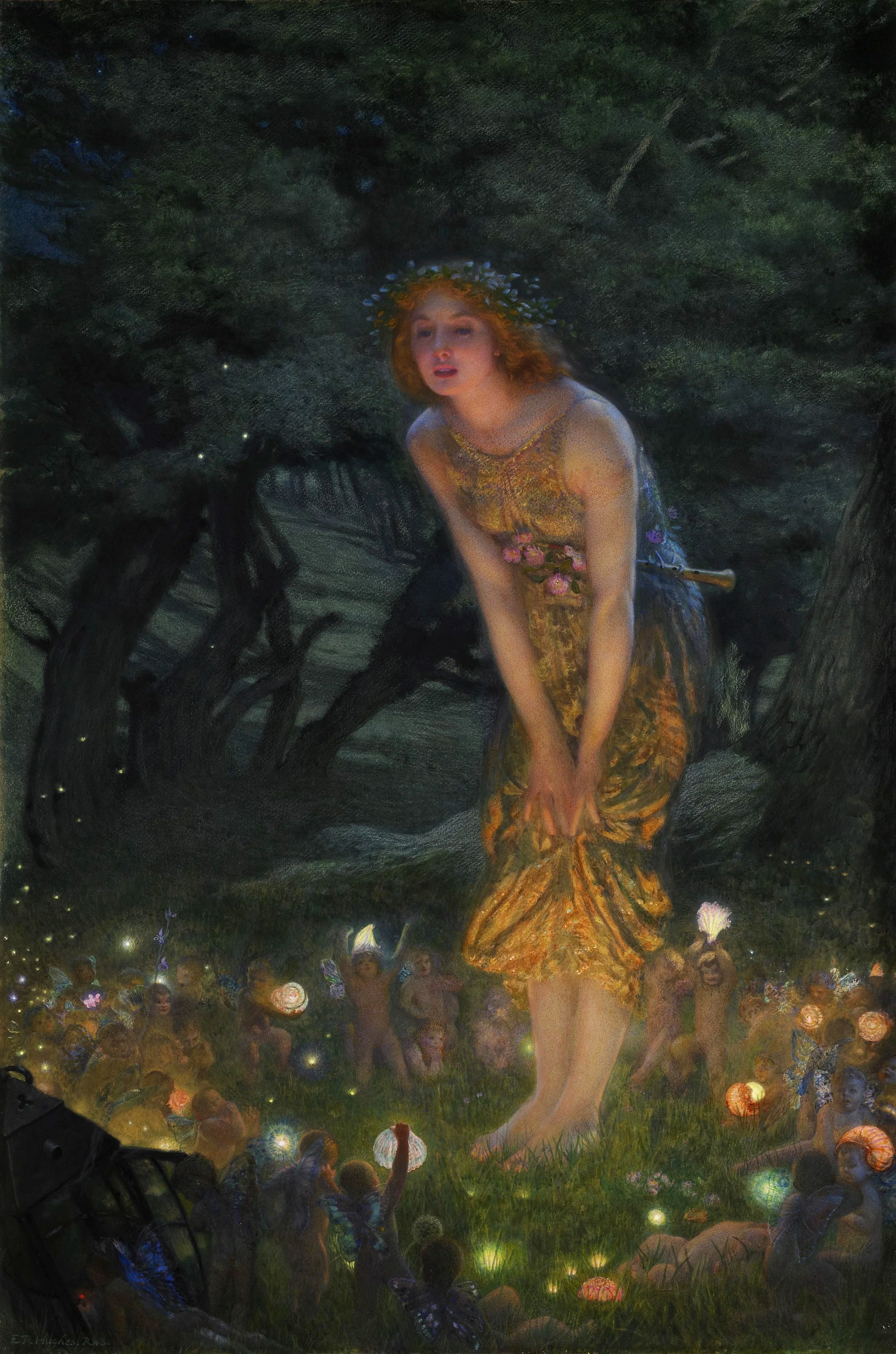 Edward Robert Hughe's "Midsummer Eve" (1908) exemplifies the refined lyricism of late Pre-Raphaelite art infused with Symbolist sensibility. Illuminated by a gentle, otherworldly glow, a young woman stands amidst a gathering of fairies in a moonlit woodland clearing. Through meticulous attention to texture, light, and atmosphere, Hughes transforms the scene into a poetic meditation on innocence, enchantment, and the fragile boundary between the human and the supernatural realms.