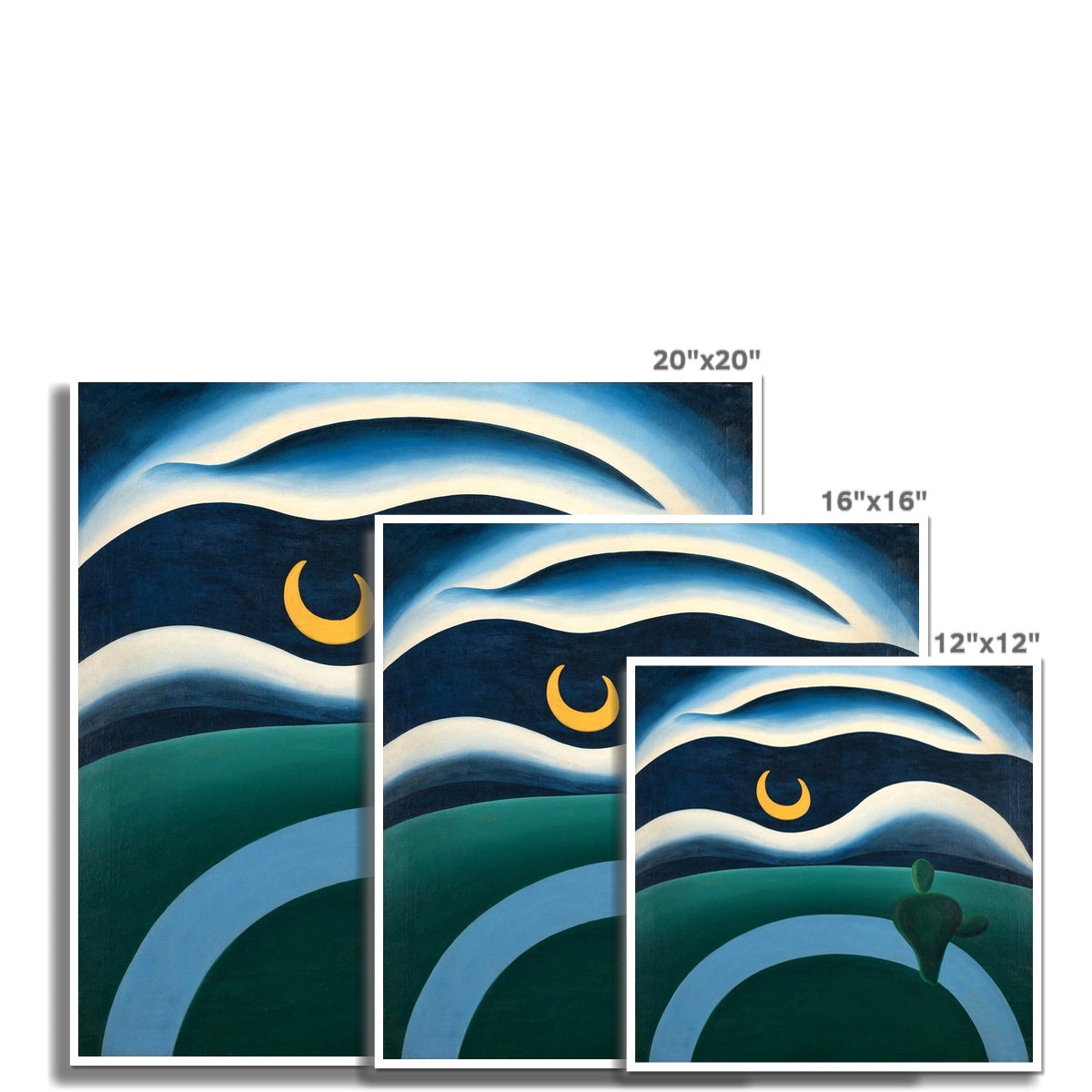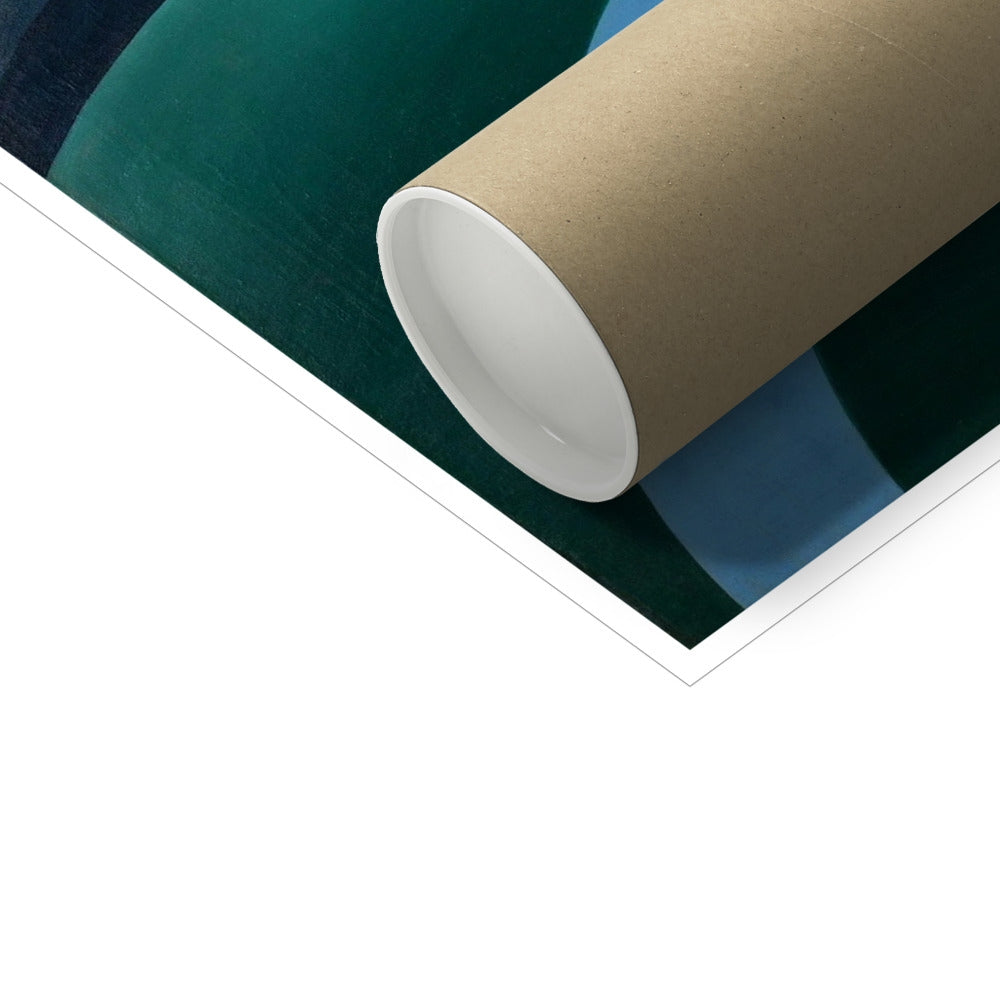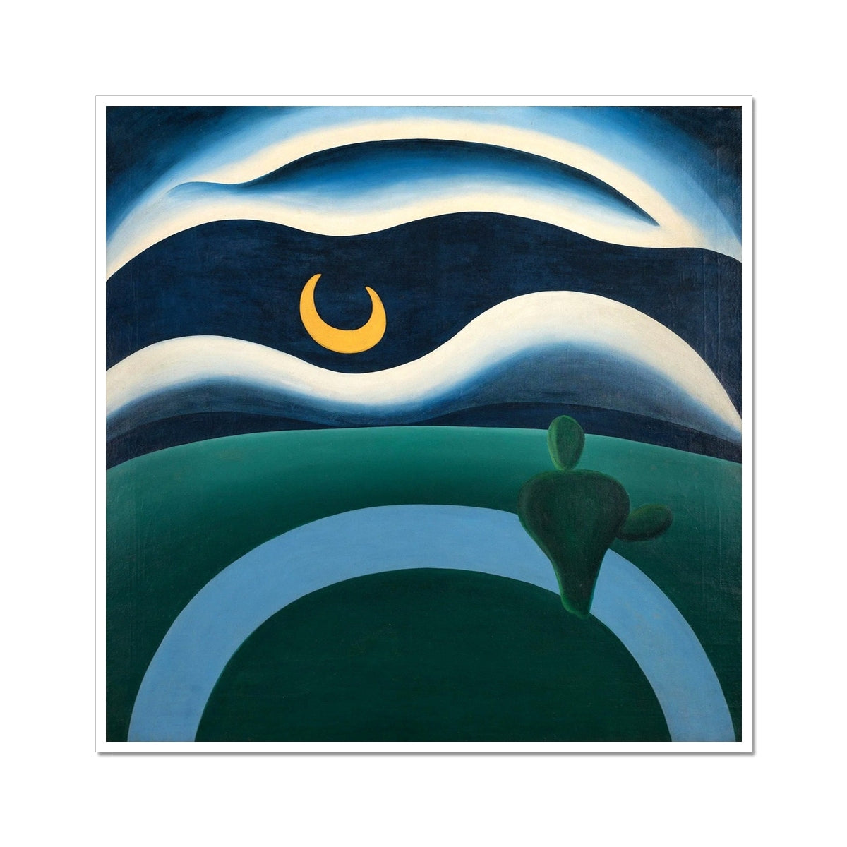 The Moon (1928) by Tarsila do Amaral is a striking example of Brazilian Modernism, transforming the night landscape into a poetic, dreamlike vision. Curving bands of deep blue, green, and pale light flow across the composition, framing a luminous crescent moon suspended in a vast sky. Simplified forms and bold colour contrasts evoke quiet contemplation and a sense of otherworldly calm, reflecting Tarsila’s distinctive blend of modernist abstraction and symbolic imagination.