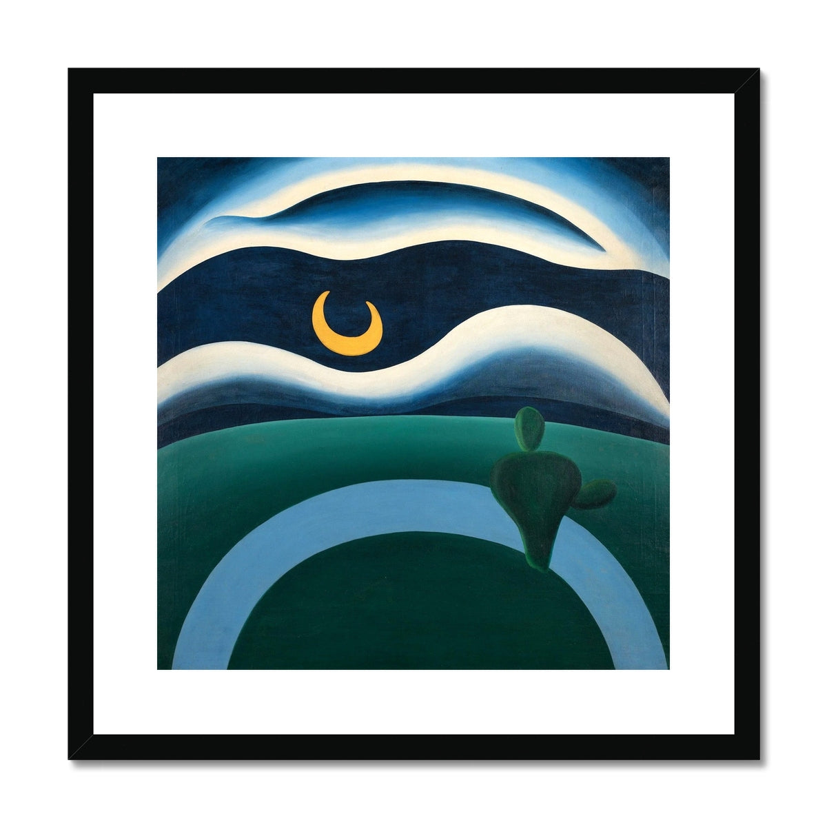 The Moon (1928) by Tarsila do Amaral is a striking example of Brazilian Modernism, transforming the night landscape into a poetic, dreamlike vision. Curving bands of deep blue, green, and pale light flow across the composition, framing a luminous crescent moon suspended in a vast sky. Simplified forms and bold colour contrasts evoke quiet contemplation and a sense of otherworldly calm, reflecting Tarsila’s distinctive blend of modernist abstraction and symbolic imagination.